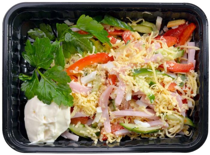 Салат с ветчиной, сыром, огурцами, перцем, яйцом и майонезом
