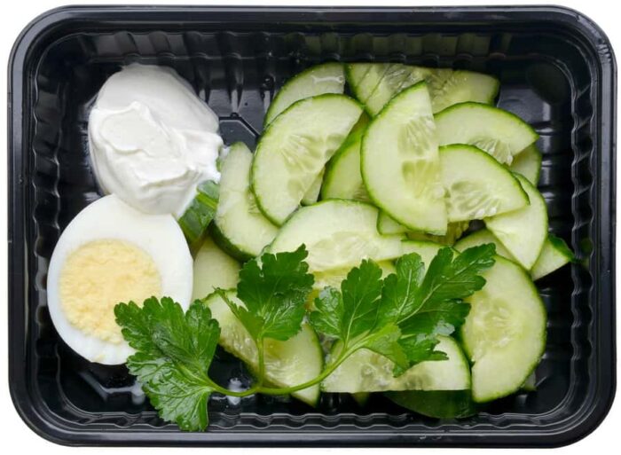 Салат из свежего огурца, яйца и зелени со сметаной 100