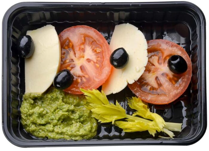 Салат с помидорами, моцареллой, маслинами и соусом песто)