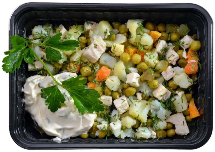 Салат с куриным филе, картофелем ,огурцами маринованными яйцом, зеленым горошком, морковью и майонезом