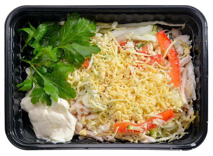 Салат с курицей, сыром, огурцами, салатом, яйцом и перцем