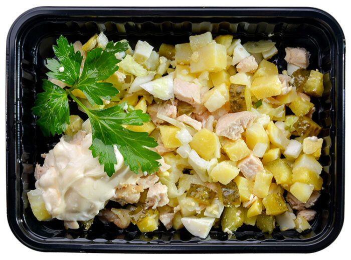 Салат с куриным филе, картофелем ,огурцами маринованными, яйцом, салатом и майонезом