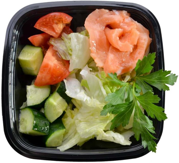 Сёмга слабосолёная, салат Айсберг, помидоры, огурцы, салат Романо, заправка «Фирменная»