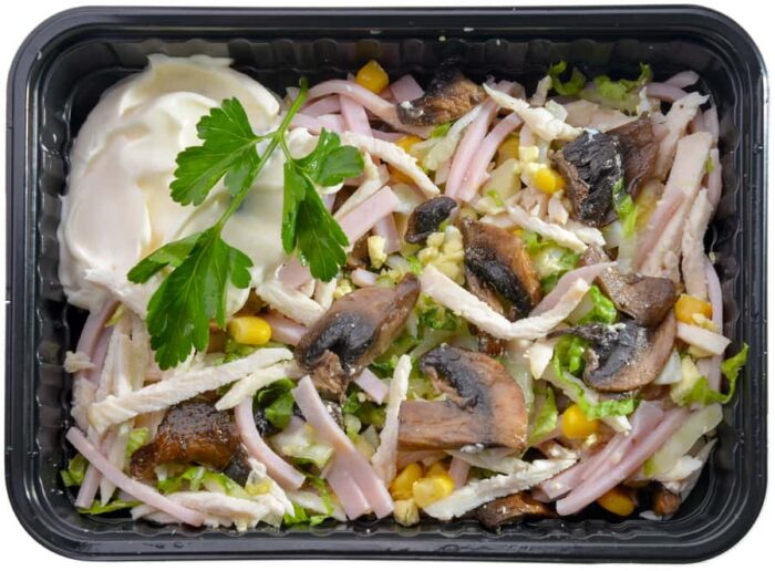 Cалат с ветчиной, курицей, грибами, яйцом, салатом, кукурузой, заправленый майонезом